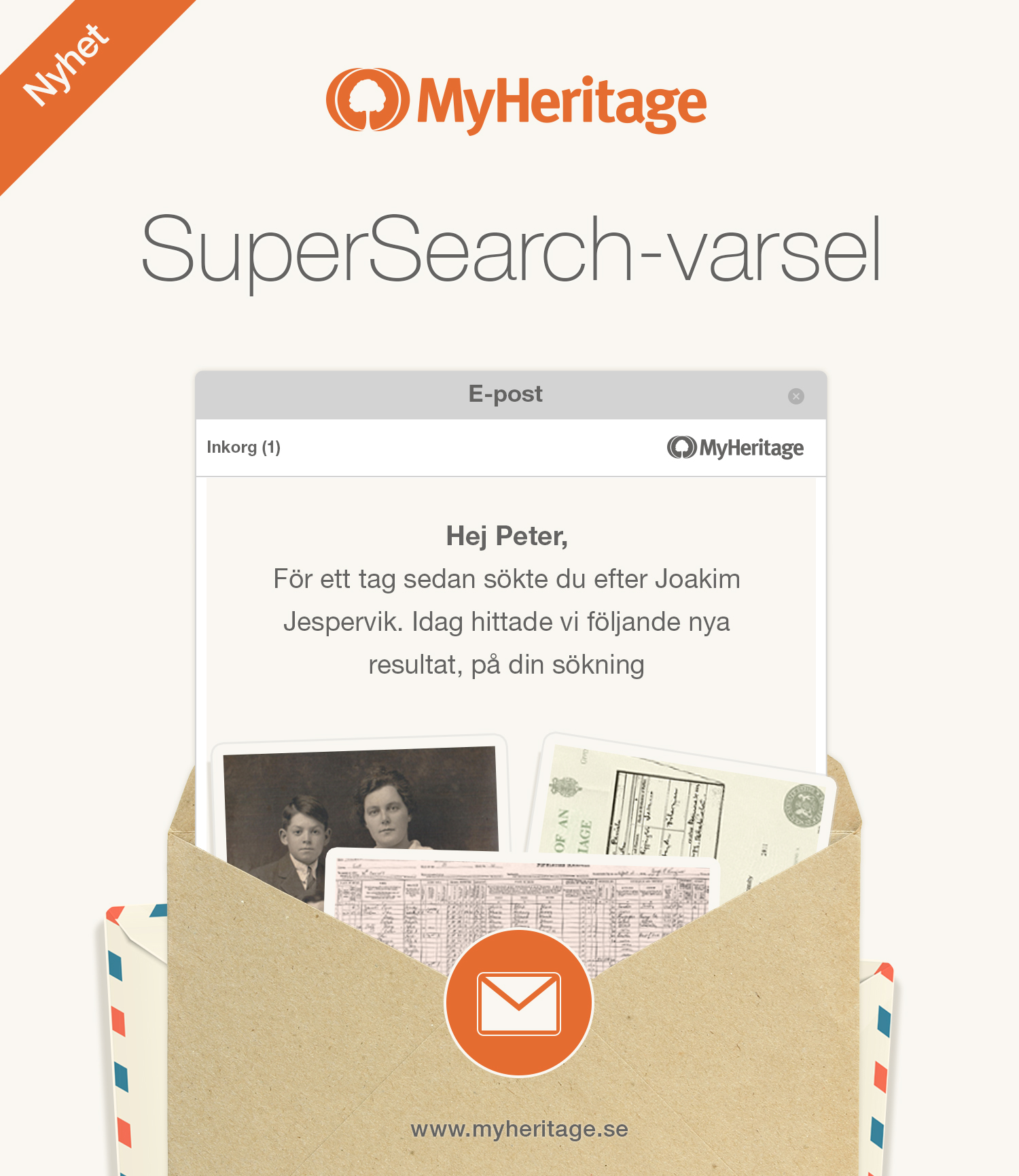 Från och med nu, upprepar vi automatiskt föregående sökningar som du har gjort på SuperSearch, i bakgrunden, var annan månad. Vi upptäcker relevanta resultat som inte fanns tidigare. Vi skickar sedan en e-post om de nya resultaten som hittades, med länkar till inlägget. Som med alla arkiv på SuperSearch, kan du först skåda inlägget för att variefiera dess relevans. Om du anser att det är relevant, kan du enkelt spara det till ditt släktträd (genom att skapa ett citat som leder till inlägget) och extrahera information till de relevanta personerna i ditt släktträd, eller lägga till nya individer till ditt träd.